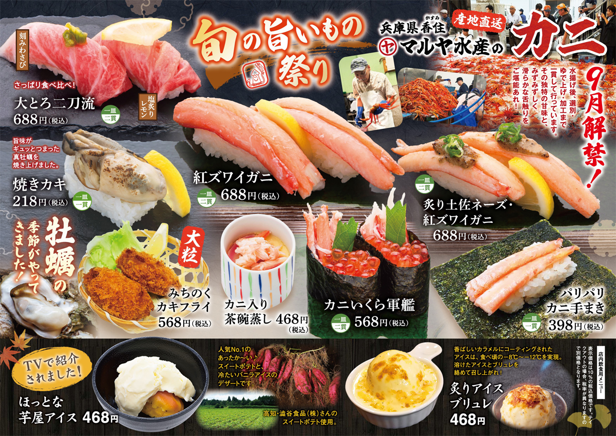 土佐近海の旬のネタをふんだんに。 そして寿しには欠かせない名物ネタは全国各地から鮮度の良いうちに取り寄せて。 目の前でにぎり、皆さまのもとへ。まわる楽しさと、豊富なおいしさで「もてなし勝負」をしております。