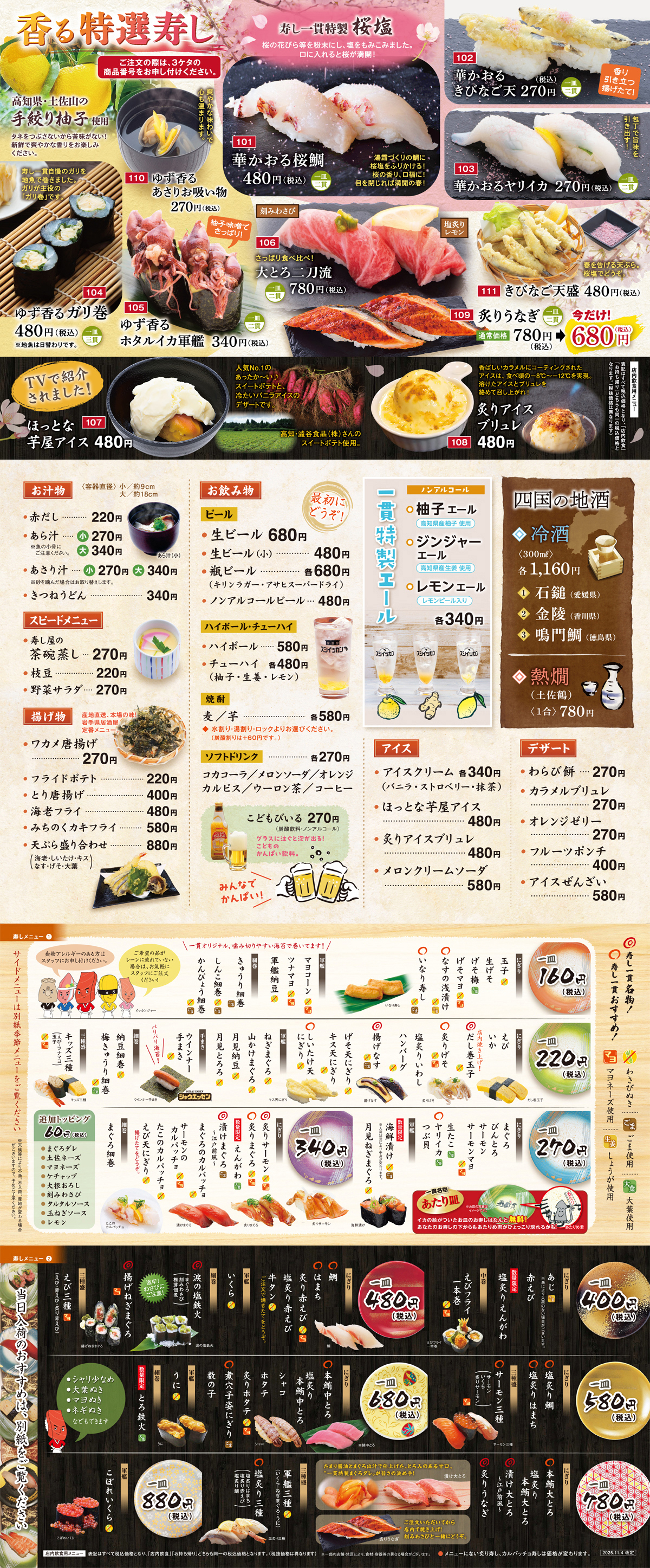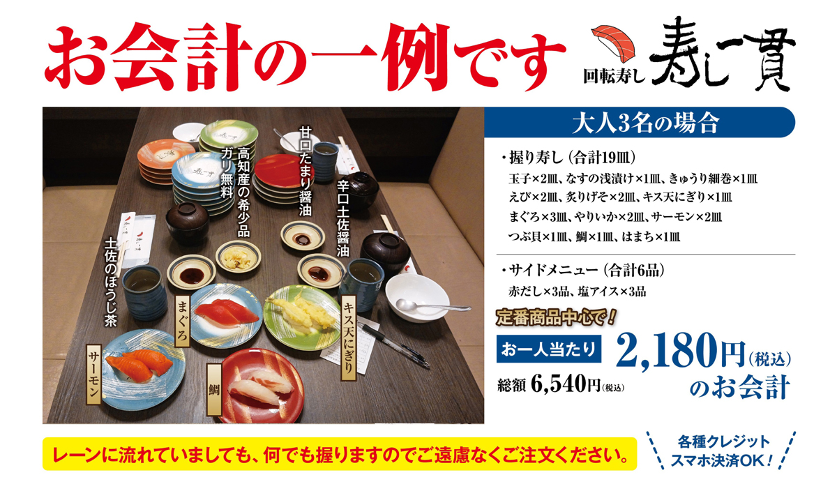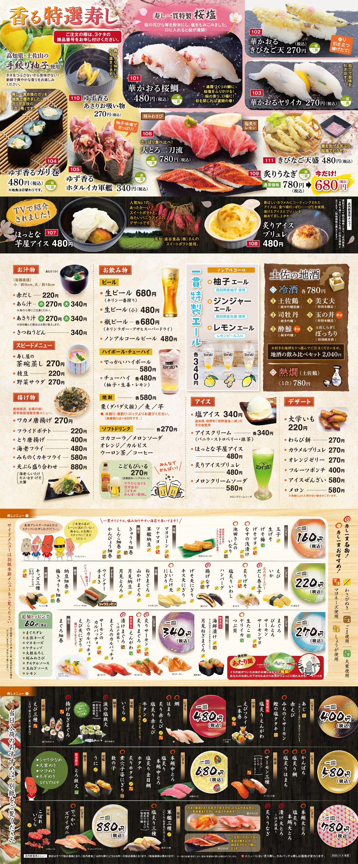 土佐近海の旬のネタをふんだんに。 そして寿しには欠かせない名物ネタは全国各地から鮮度の良いうちに取り寄せて。 目の前でにぎり、皆さまのもとへ。まわる楽しさと、豊富なおいしさで「もてなし勝負」をしております。