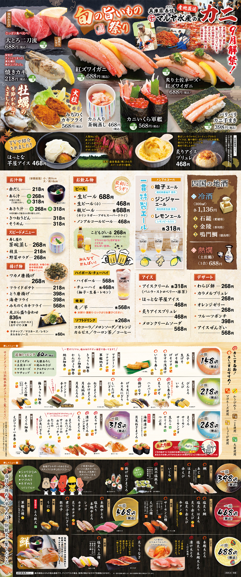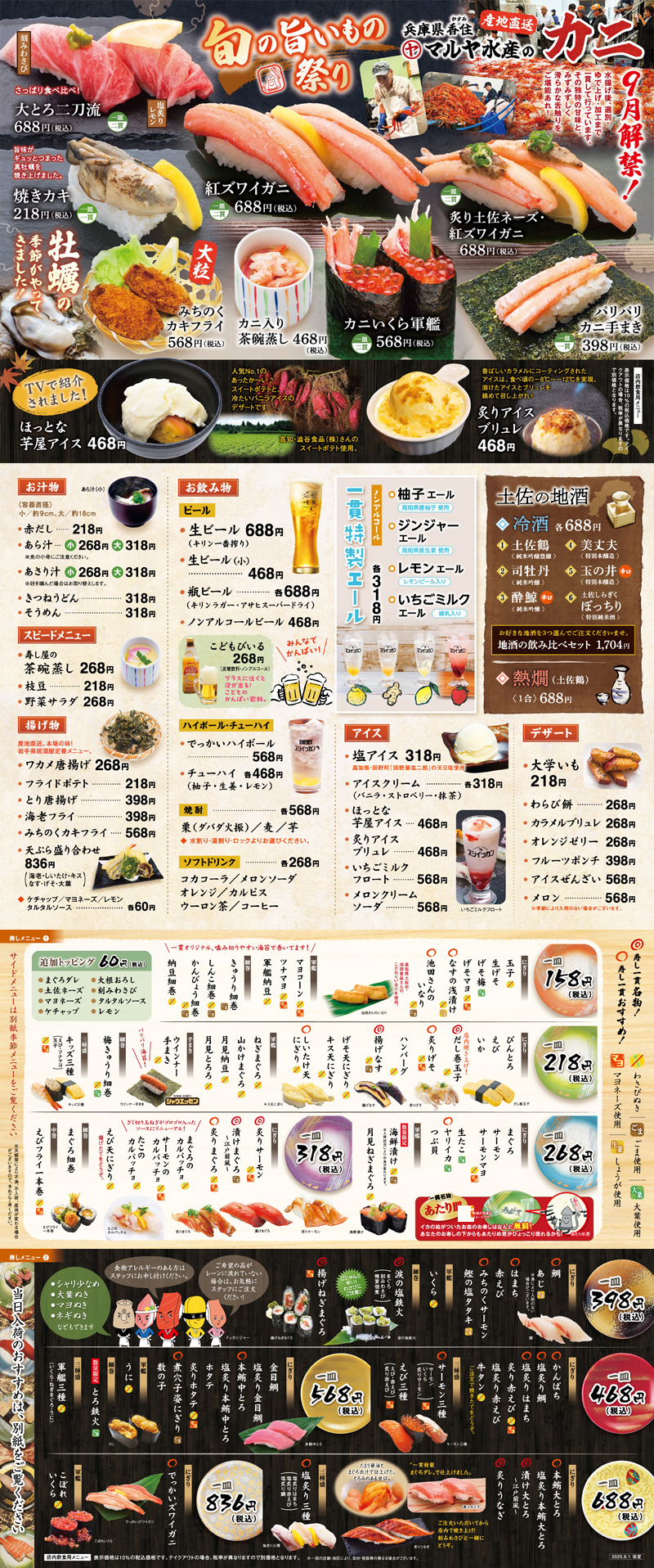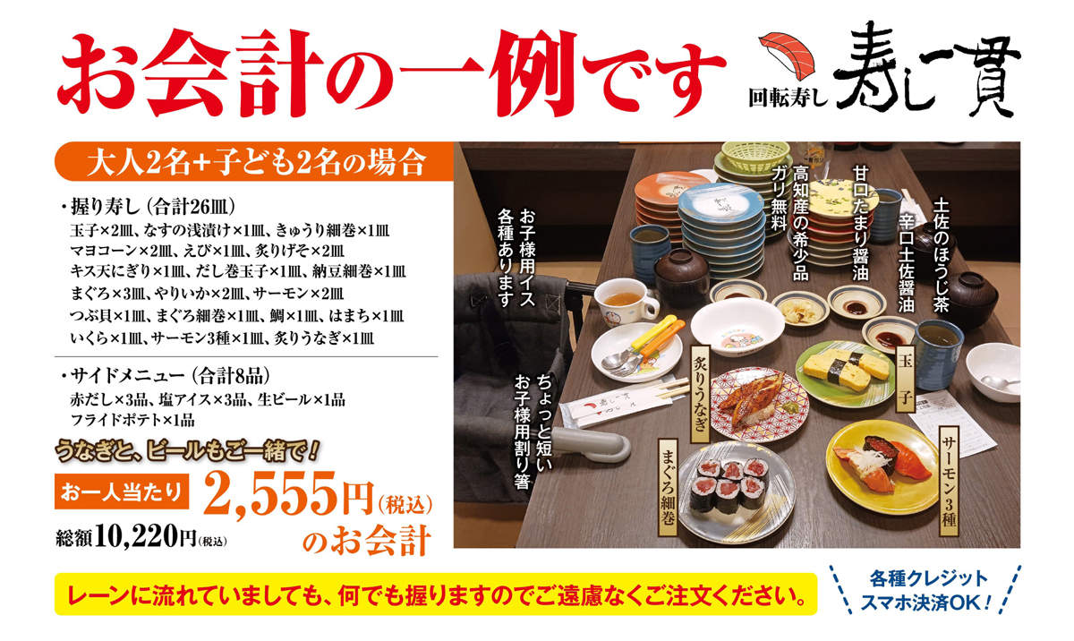 土佐近海の旬のネタをふんだんに。 そして寿しには欠かせない名物ネタは全国各地から鮮度の良いうちに取り寄せて。 目の前でにぎり、皆さまのもとへ。まわる楽しさと、豊富なおいしさで「もてなし勝負」をしております。